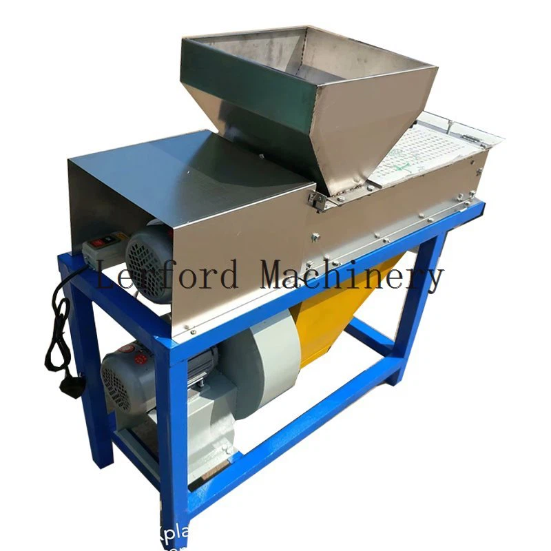 La peladora de maní está compuesta por un dispositivo de potencia (que incluye motor, polea, correa, cojinete, etc.), marco, tolva de alimentación, rodillo de pelado (rodillo de acero o rodillo de arena), ventilador de succión, etc. La máquina peladora de maní en seco adopta el funcionamiento principio de transmisión diferencial del rozamiento por rodadura. Después de tostarlos, los cacahuetes se pelan cuando la humedad es inferior a cinco (para evitar tostarlos) y luego se tamizan con un colador. Mientras que los granos de maní, los medios granos y las esquinas rotas se separan, lo que tiene las ventajas de una alta productividad, un buen efecto de pelado y una tasa baja de medio grano.